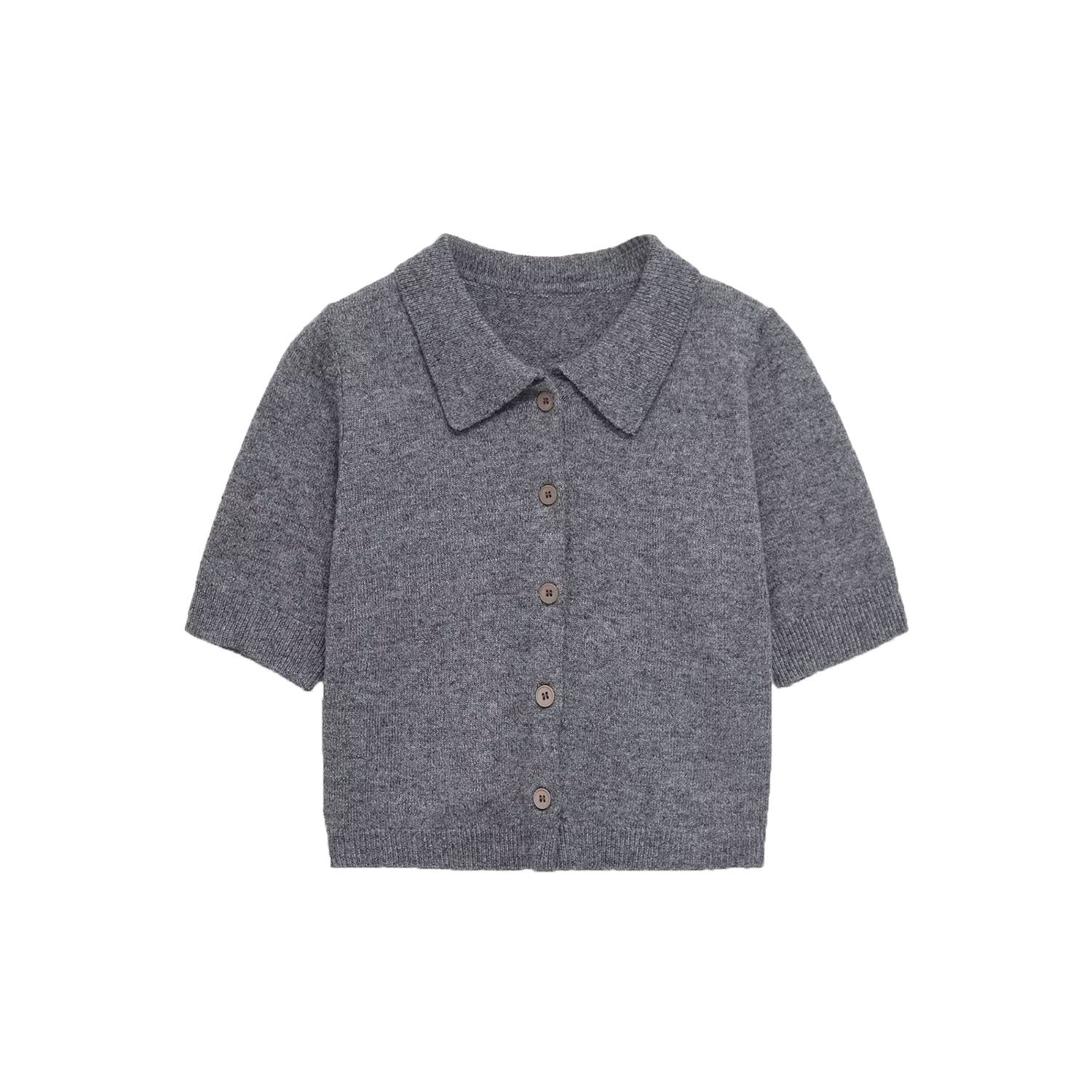 Meet the MeandMio Grace | Gray Soft Knit Short Sleeve Polo Cardigan.