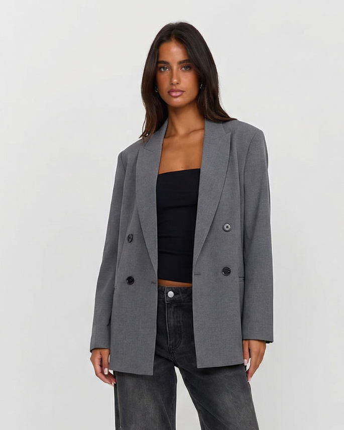 Meet the MeandMio Essential Double-Breasted Blazer - Gray.