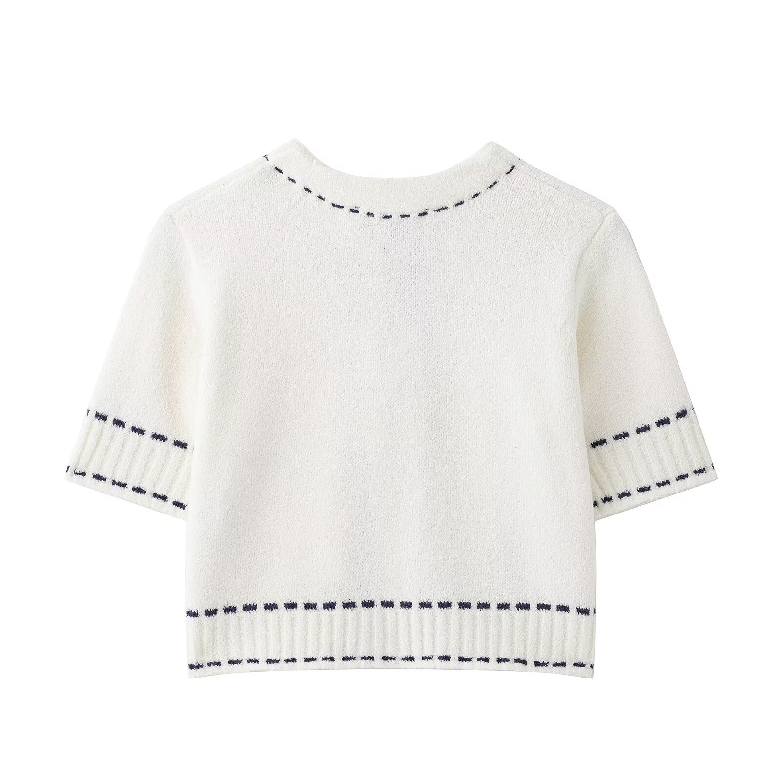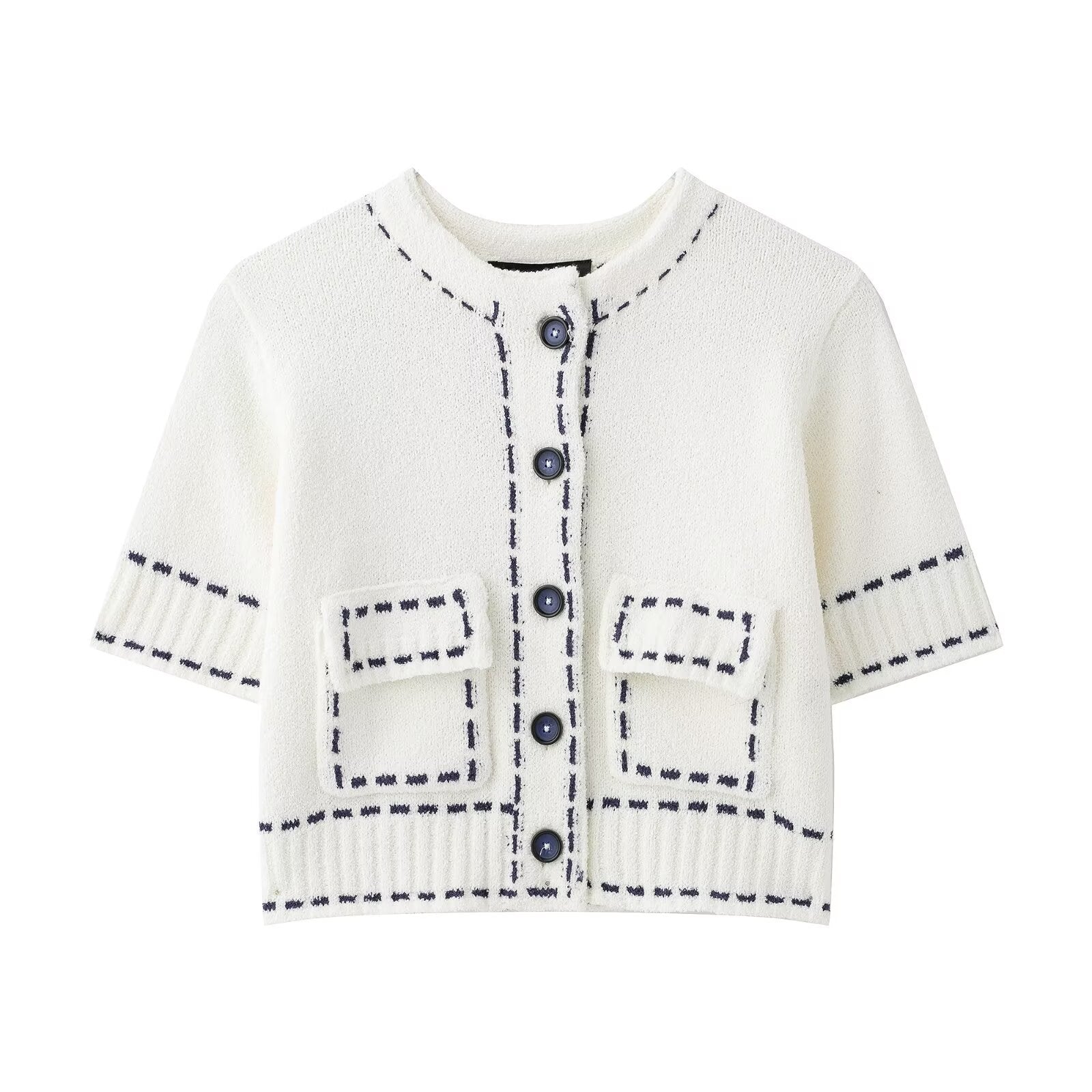 Margot | Cropped Blouse White Short Sleeve Button Front Contrast Stitch